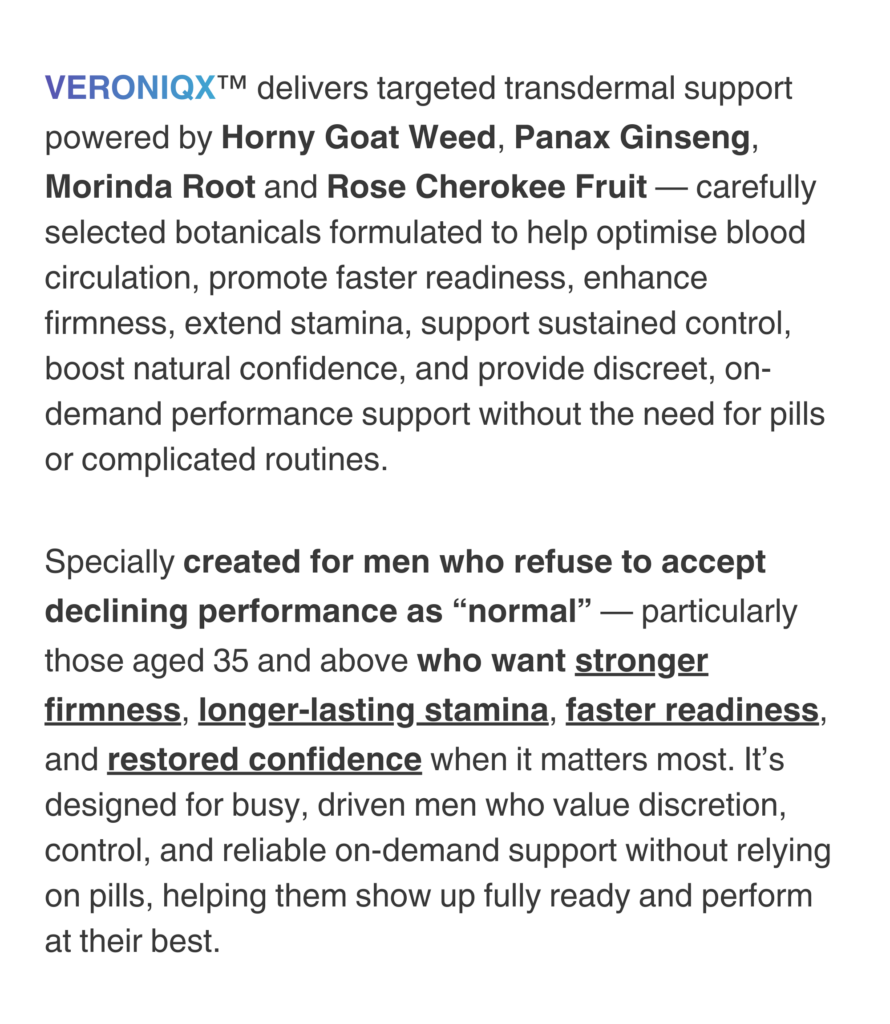 VERONIQX™ is formulated with carefully selected performance-support ingredients designed to help optimise blood circulation, enhance responsiveness, and support sustained stamina.